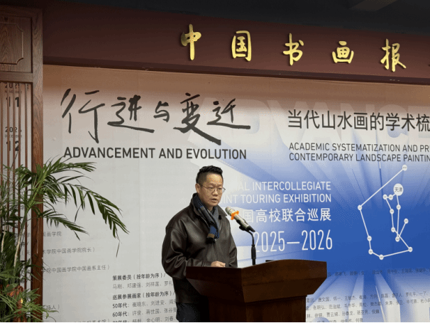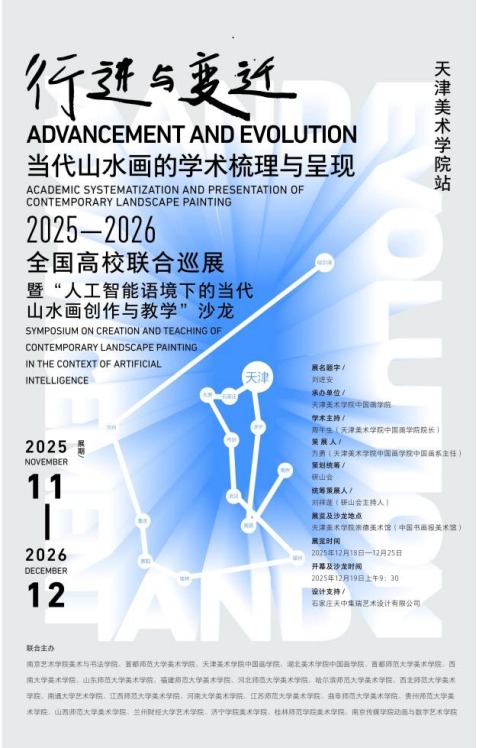 2025年12月19日,“行进与变迁——当代山水画的学术梳理与呈现(2025-2026全国高校联合巡展暨“人工智能语境下的当代山水画创作与教学’沙龙)”在天津美术学院崇德美术馆正式拉开帷幕。本次活动由研山会联合国内多所高校共同发起,天津美术学院中国画学院承办,汇聚了当代山水画坛多元风格的精品力作与专家学者,呈现出山水画创作领域的前沿面貌,为高校师生及艺术爱好者搭建起学术交流与思想碰撞的优质平台。