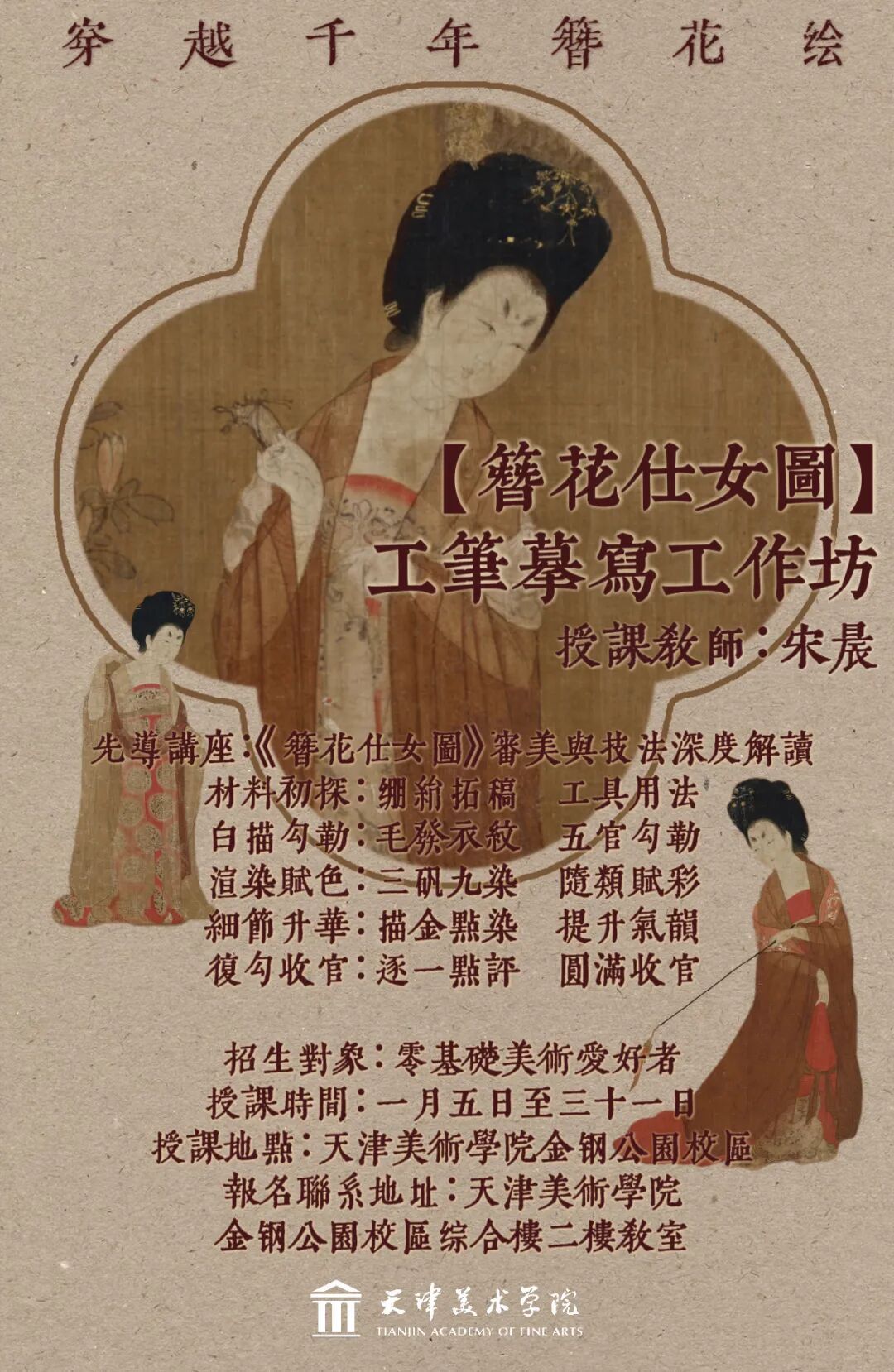中国唐代工笔仕女画以雍容典雅的审美气韵,铸就了人物画史上的不朽传奇,其中《簪花仕女图》更以“浓丽丰肥”之貌成为唐代美学标识。当传统丹青技艺在当代艺术语境中焕发新生之际,对经典的深度临摹恰是激活艺术创新的必经之路。本次天津美术学院夜校课程将带您亲手摹写《簪花仕女图》,以绢帛为镜,以笔墨为舟,系统解密唐代工笔“三矾九染”“高古游丝描”等传统技法,邀您在笔墨丹青之间体悟千年之前的生活意趣,于华灯初上时开启一场与盛唐仕女的跨时空对话,让大唐气象在笔尖重生。