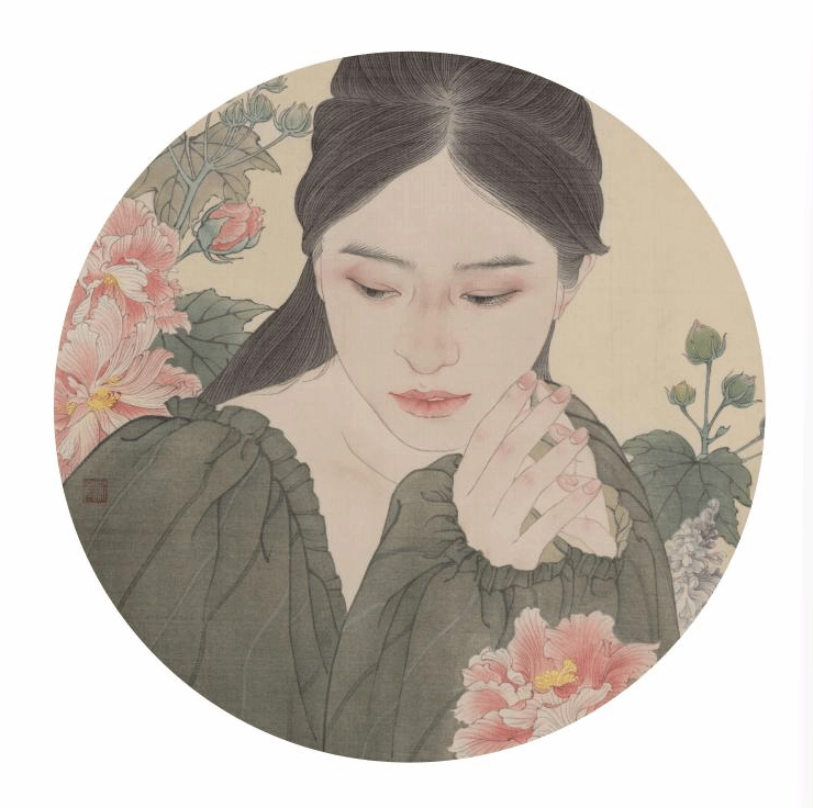 《工笔人物团扇》30cmx30cm绢本