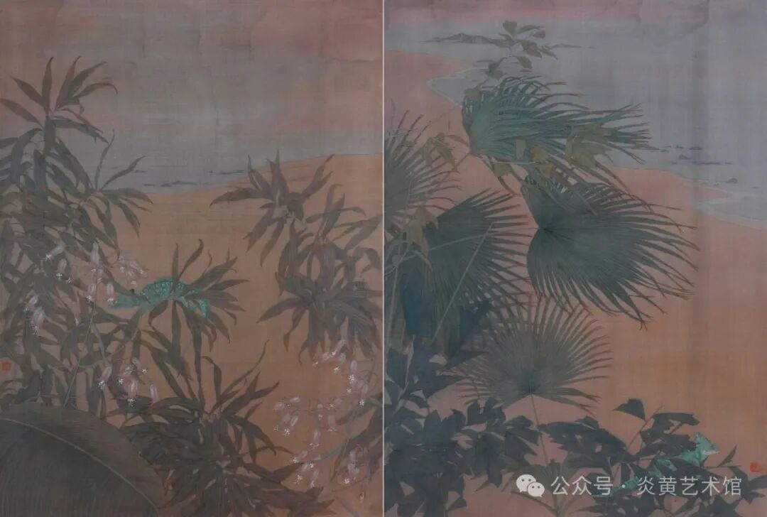 作品《晚风》组画以工笔重彩的形式描绘了创作者在南洋旅行期间的所见,通过描绘夕阳下海岸边的植物和动物,表现了当地的自然风光。作品一方面接续了宋元时期工笔花鸟画的“写真”传统,追求细致、严谨的物象刻画和“格物致知”的精神表达,另一方面也从西方绘画,特别是古典绘画中汲取养分,将西方绘画对于光影、冷暖和质感的捕捉融入其中,创设出静谧而具有古典美感的视觉情境。