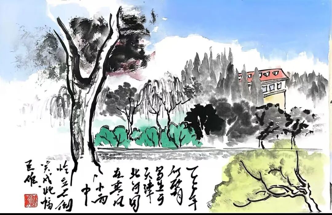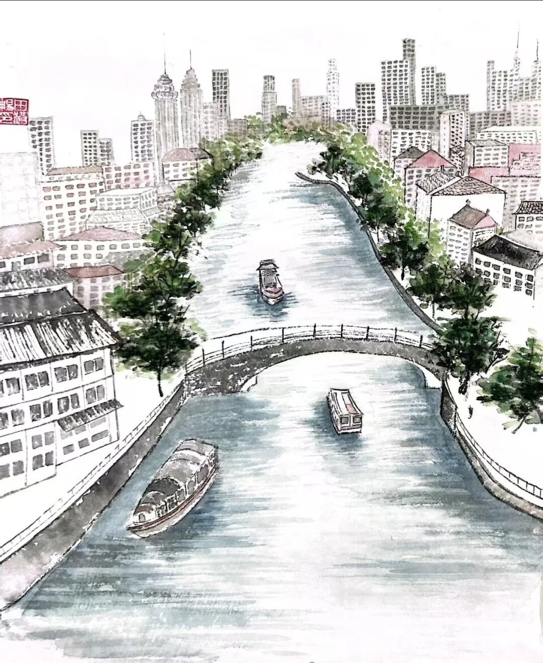 《津门运河吟》以水墨淡彩绘天津运河风貌,承续了《潞河督运图》写实传统,整体融老城灰瓦与现代高楼,以写意与没骨法,展现古桥、游船、街巷共生之景,暗含“水载城兴”之意。此为北洋园运河采风之作,以现代视角再现千年运河生机,书写津城古今交融的文化交响。