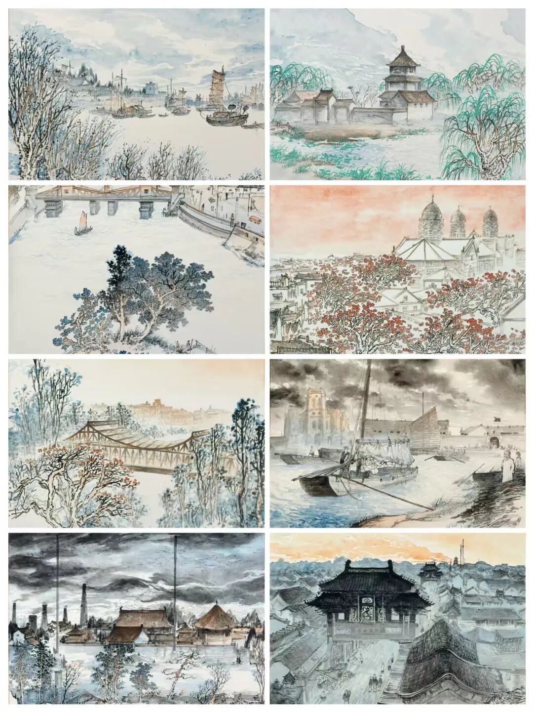 《津河旧志组画》以八幅浅绛绘京杭大运河天津段,截取1864至1983年间八个时空断面,成水脉串联的视觉方志。运河见证津门漕运盛景、军屯岁月,亦历经条约租界的沧桑,直至引滦通水的新篇,既载往昔悲慨,亦藏时代变迁。画作凝运河为历史亲历者与记录者,于逝水苍茫中,见古今之志,映现世万家灯火的安宁。