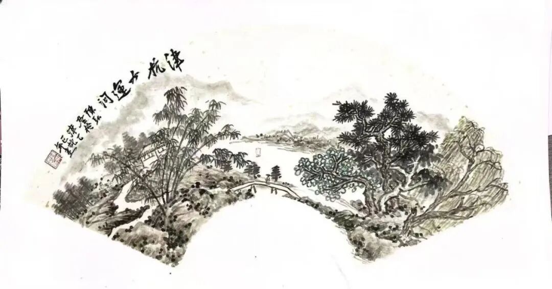 这幅扇面以水墨晕染出津杭大运河的悠远意境,近处竹影婆娑、松枝苍劲,小桥流水间行人往来,远处帆影点点、山峦叠翠,尽显江南与津门的交融之美。笔墨间既有传统山水画的空灵意境,又暗含运河千年的历史厚重,让人在咫尺扇面中,感受到这条黄金水道连接南北、贯通古今的磅礴生命力。