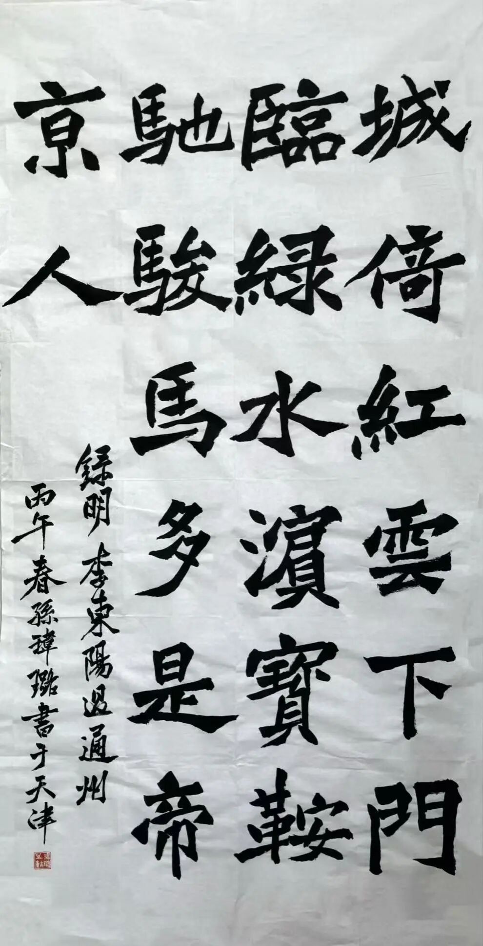 本楷书作品录明李东阳《过通州》诗,以魏碑笔意入楷,厚重大方的字形契合运河枢纽通州的历史气象。书写强化笔画顿挫与结构开张,呼应运河贯通南北的功能;四尺整张竖式布局,以字距行距的空间节奏隐喻运河舟楫往来的动态。落款点明津门创作坐标,与通州同属京畿文脉,以书法转译古典诗境,叩问并当代表达运河文化精神。