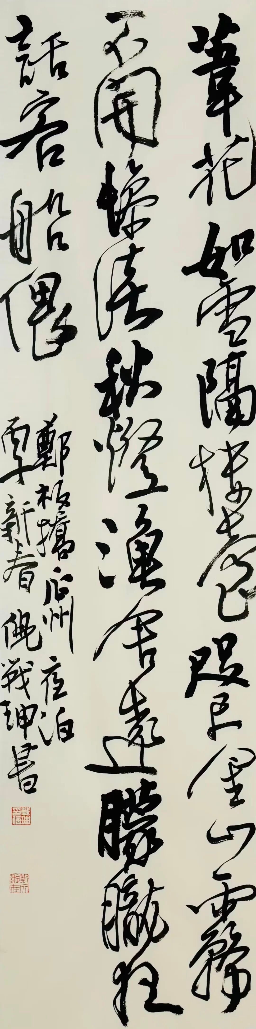 本作品为行书条幅,书写郑板桥同名诗作,技法取法王铎涨墨法与缠绕笔意,以雄浑线质呼应诗中苍茫气象。瓜州为运河要津,承载漕运繁荣与文人情思,郑板桥曾于此凝运河涛声为笔墨。王铎与运河文化渊源深厚,其笔墨张力恰合运河奔流之态。作品以书写运河畔诗篇对话运河文化,让千年河涛在笔墨间重焕生机。