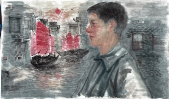 这幅作品以天津大运河清晨为背景,展现中国共产党早期领导人张太雷坚毅的侧影,他凝视着曾经学习奋斗的土地。画面深处,一艘红船破开津门晨雾,沿着千年运河驶向远方,象征着红色火种经由运河血脉终成燎原之势。初升红日与水面交相辉映,暗合“太雷”破晓寓意,昭示光明新中国势不可当。通过“张太雷-运河红船-津门晨光”的构思,将大运河升华为中国革命征程的见证者,诠释天津在中国革命史上的独特地位。