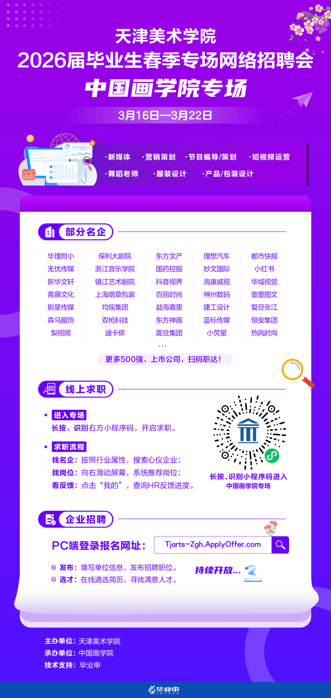 PC端登录下方报名网址:Tjarts-Zgh.ApplyOffer.com登录:点击右上方“我要招人”;发布:填写单位信息,发布招聘职位;选才:在线遴选简历,寻找满意人才。