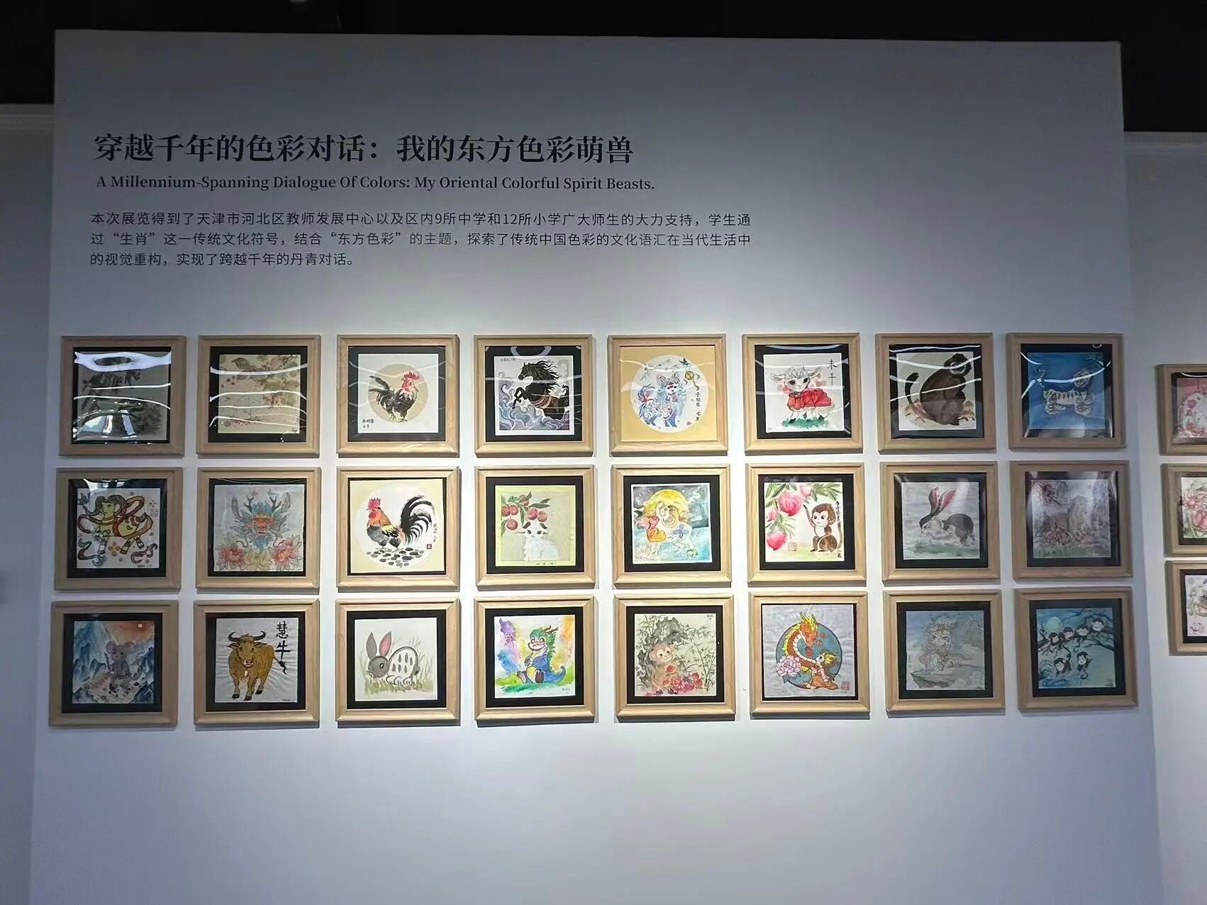 此外,本次展览得到了天津市河北区教师发展中心及河北区内 9 所中学、12 所小学广大师生的积极参与。学生们以“生肖”为切入点,结合东方色彩,对传统色系在当代生活中的视觉重构展开创作,为展览增添了鲜活的公众视角。