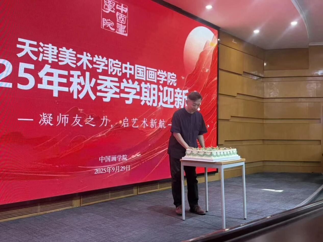 迎新会尾声,中国画学院副院长赵栗晖教授代表学院为新生切蛋糕送祝福。