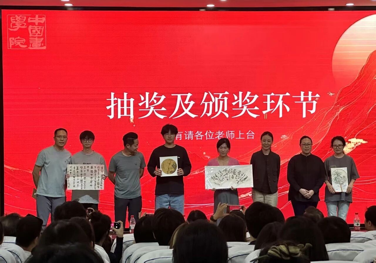 为表达学院对新同学们的热情欢迎和殷切希望,弘扬好国画学院以老带新,以生为本的优良传统。学院特邀请了部分教师代表为新生同学们精心创作了书画作品,赠送给同学们。(以同学们喜欢的抽奖方式,随机抽取出幸运同学,被抽取的为受赠同学)。这份饱含温度的礼物不仅是简单的祝福,更是老师们用擅长的笔墨为刚踏入丹青世界的新生递上的“第一份专业指引”,是把“艺术要用心”的道理藏在笔墨里的言传身教。让同学们真切感受到中国画学院“以艺传情、以画会友”的温暖。