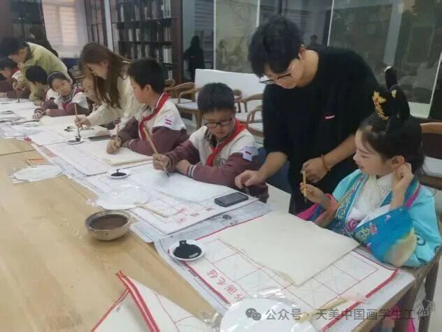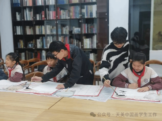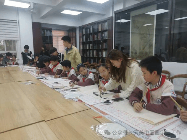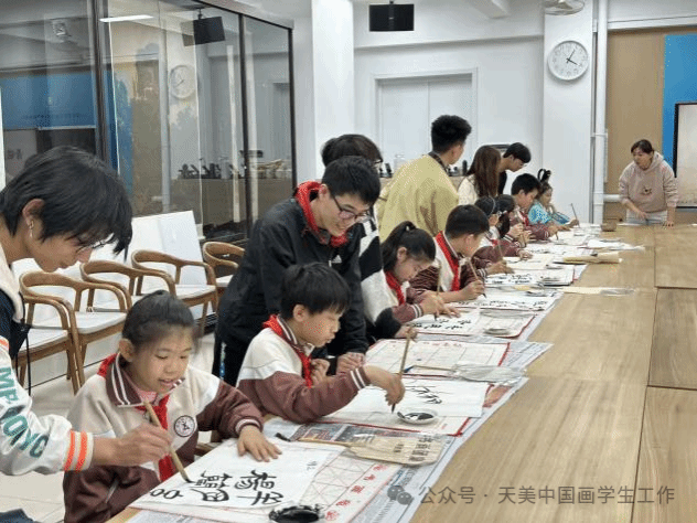 活动最后阶段。中国画学院学生以“手把手”实操指导方式,指导天音民乐系学子和昆明路小学小学生们掌握书法、国画的基础创作技巧,并实时解答学生提出的疑问。该环节精准落实“大中小学一体化”育人理念,搭建起高校与基础教育阶段学生的直接交流桥梁,让小学生在实践操作中近距离感受传统书画艺术的魅力,夯实了传统文化传承的基层基础,推动文化传承从“认知”向“实践”转化。