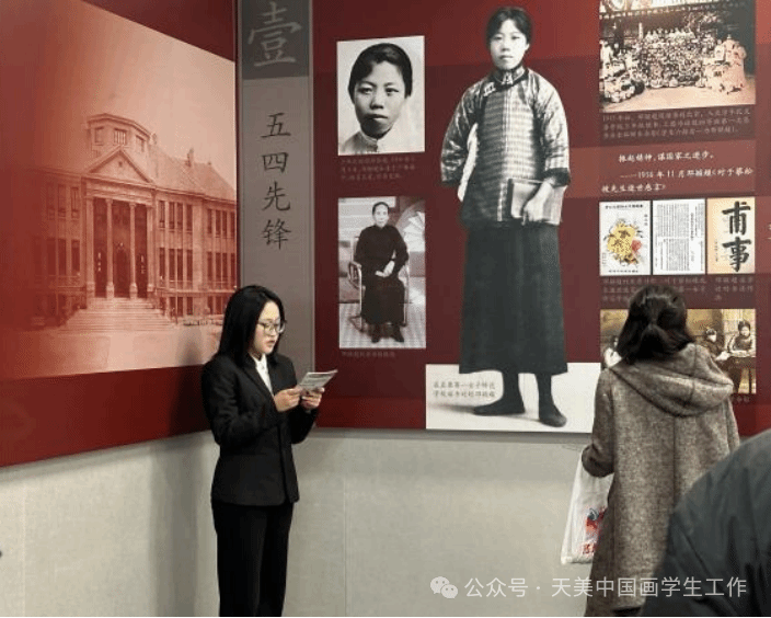 在一楼展区,讲解员详细介绍了校友邓颖超同志的生平事迹:她考入直隶女师后,积极投身于进步运动,成为了一名杰出的革命先驱。她的家国情怀与不懈奋斗的精神,为广大学子树立了崇高的精神典范。