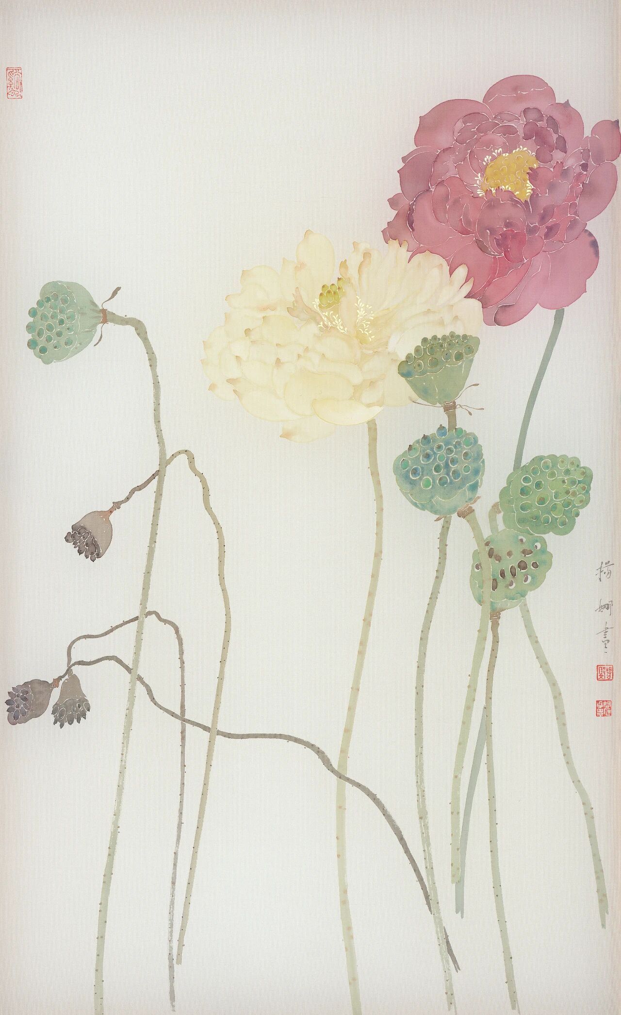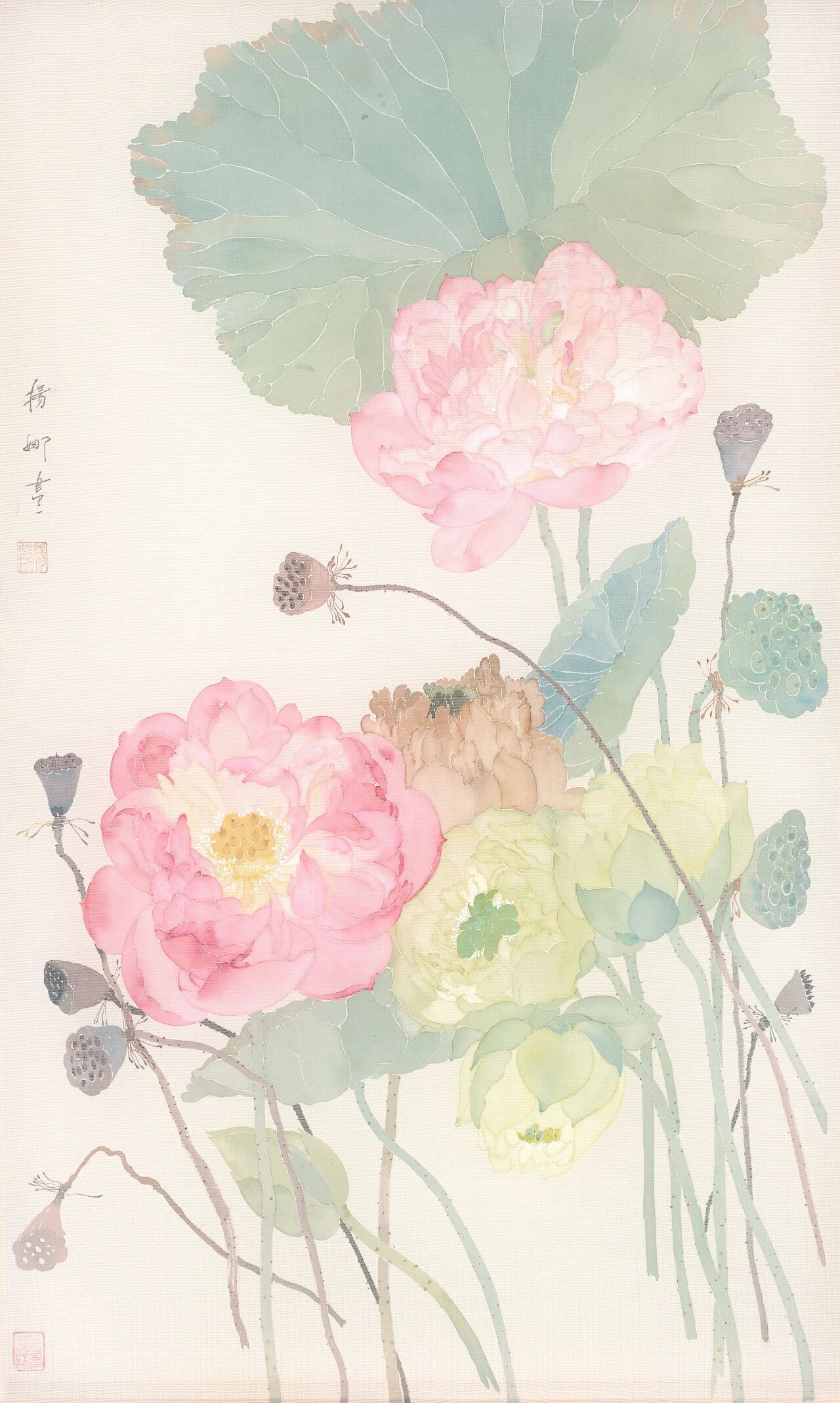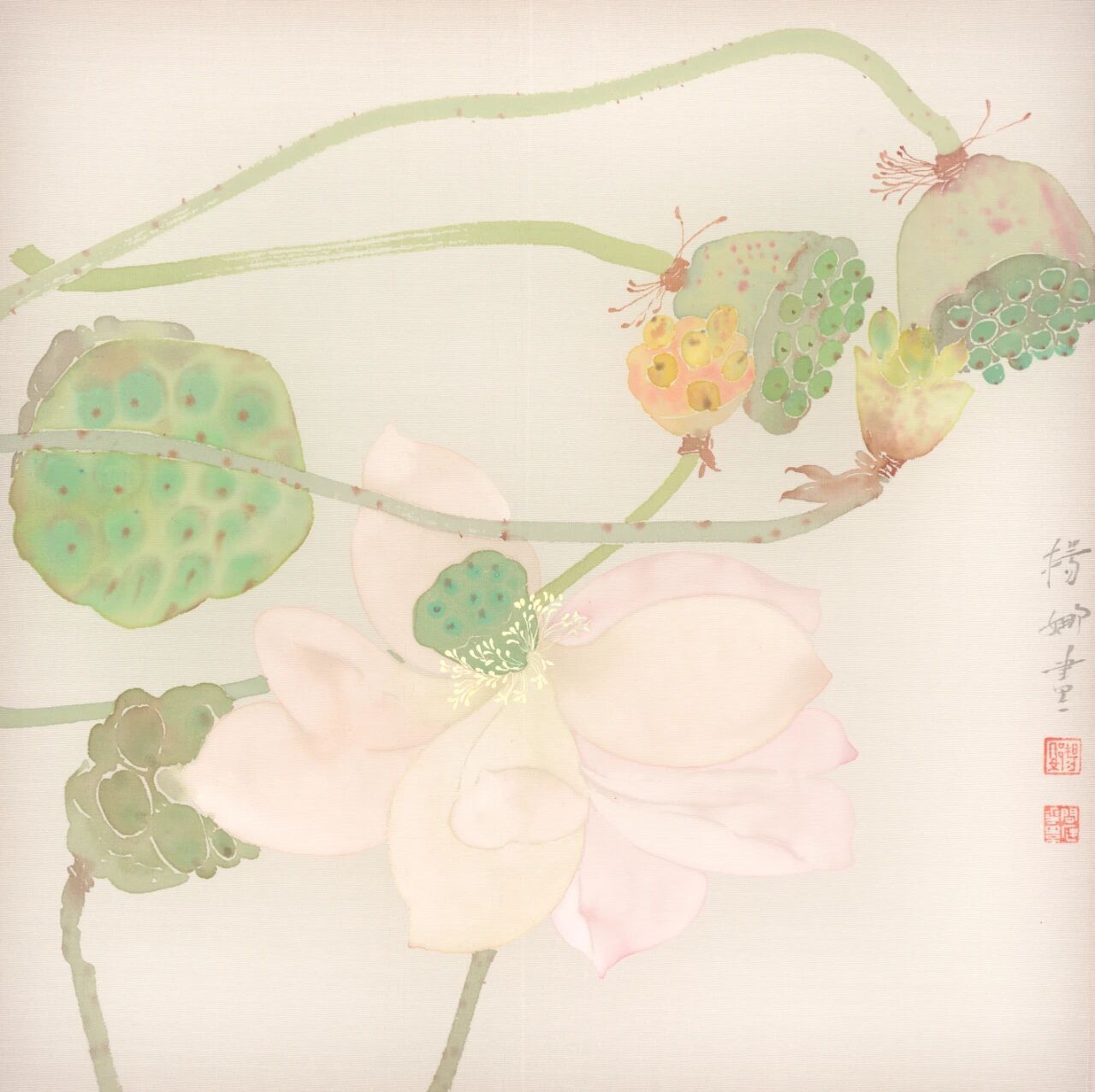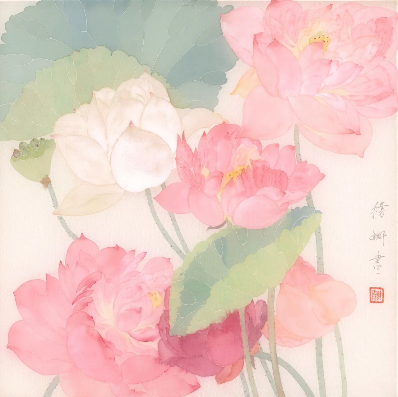 杨娜天生就具有荷花一般的品质,惺惺相惜般的也喜爱赏荷画荷,体悟荷花的含苞绽放,心事也如莲房隐藏在花瓣里,也会随着无可奈何的落下的花瓣而感伤,所以杨娜画荷花就是画自己。每当夏季来临荷风荡漾的时候她的邈邈心思也随着起伏荡漾,守着那一片繁花盛开的荷塘,那含着涩涩的清香沁入心脾,通体舒畅,捧一片花瓣在手,物我两忘,不知她是荷花还是荷花是她。