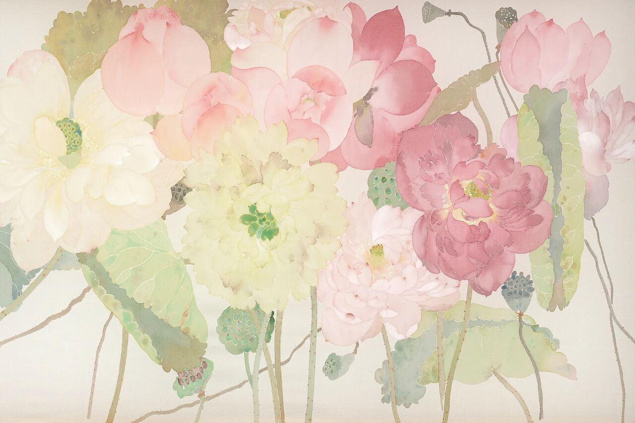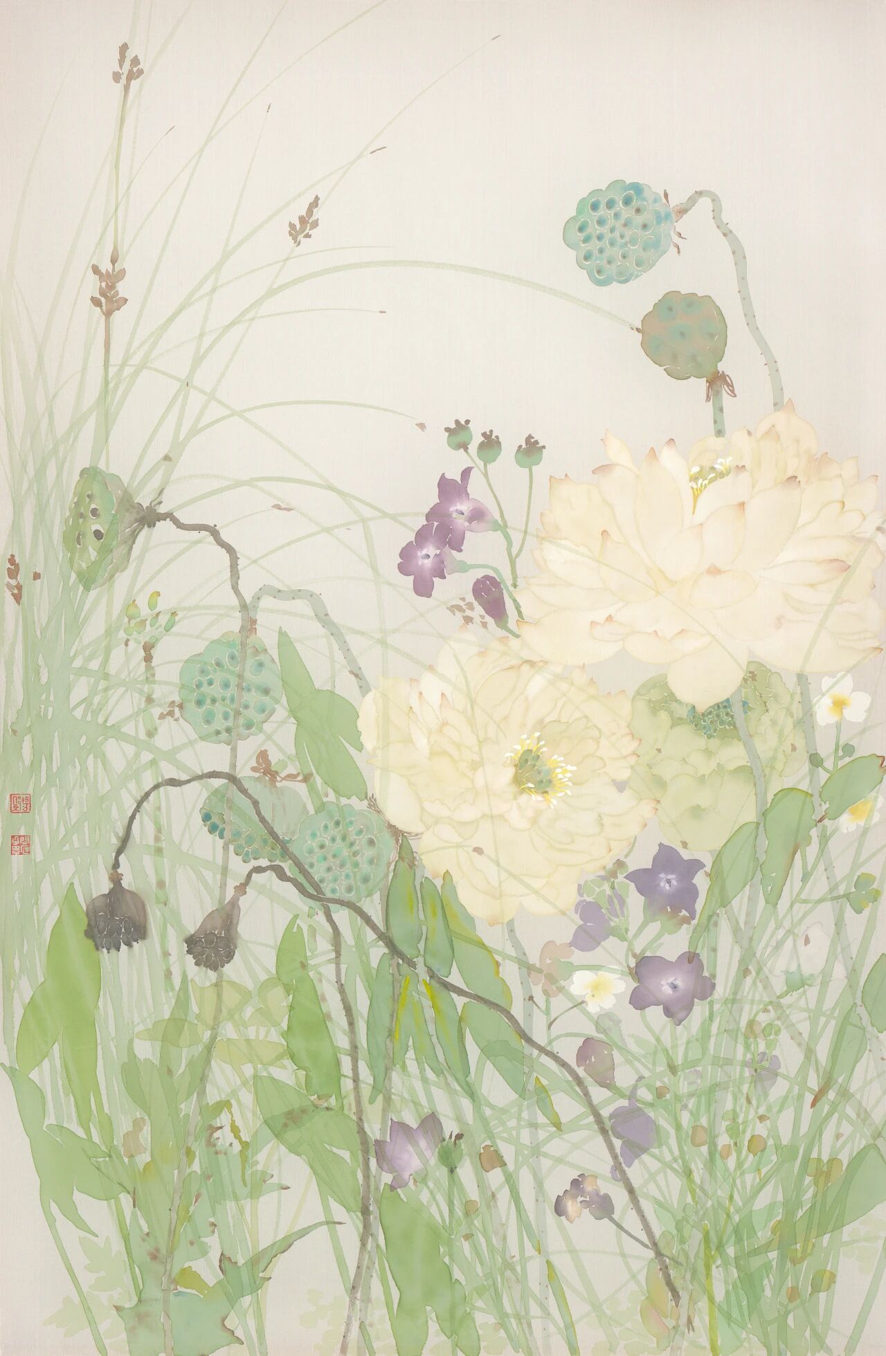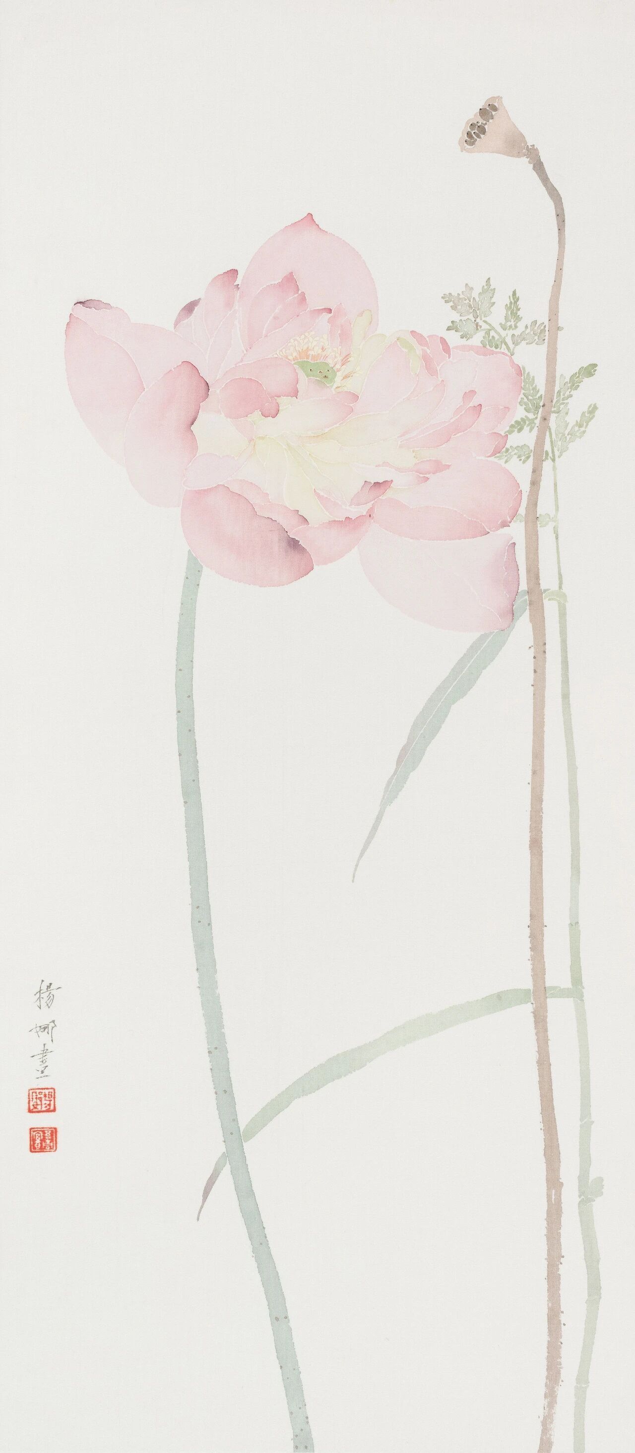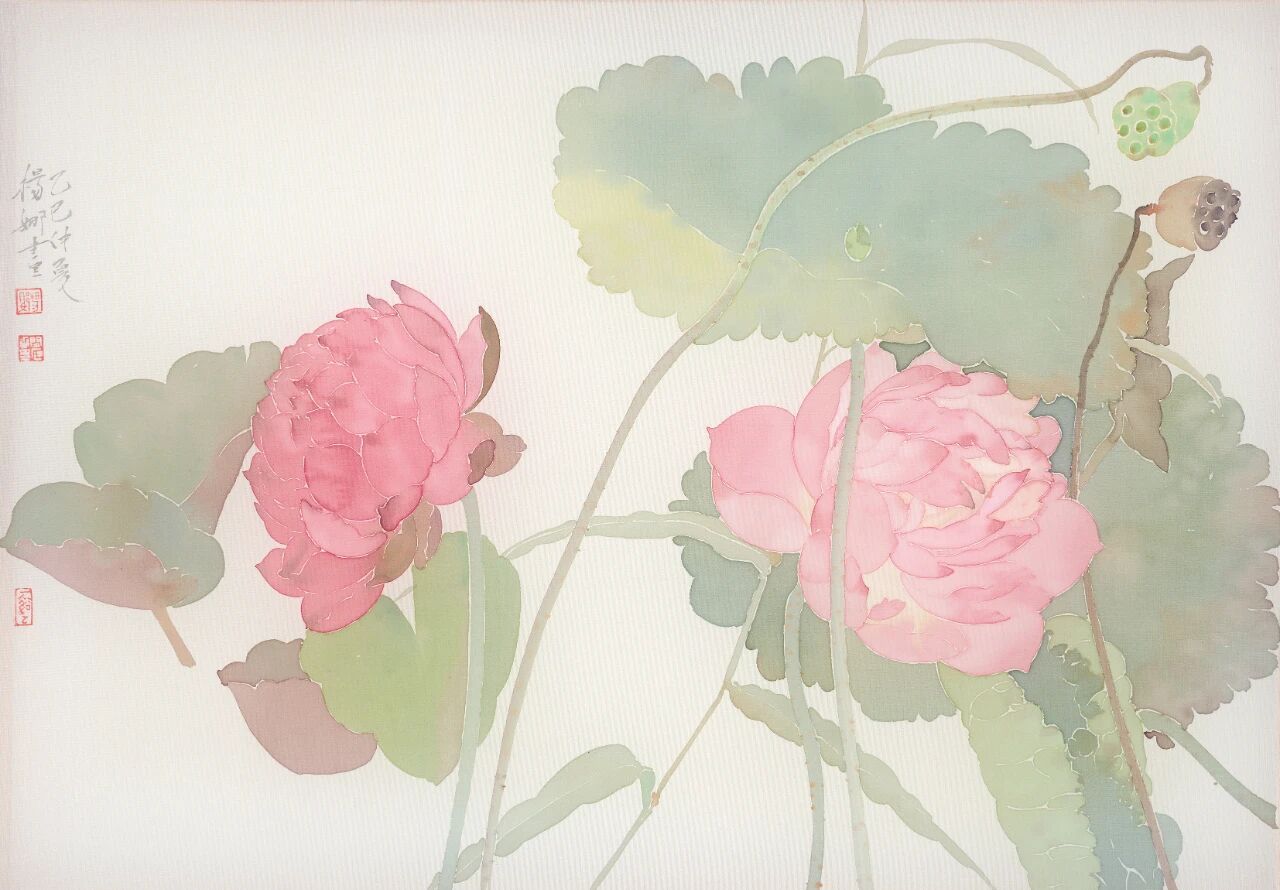 杨娜天生就具有荷花一般的品质,惺惺相惜般的也喜爱赏荷画荷,体悟荷花的含苞绽放,心事也如莲房隐藏在花瓣里,也会随着无可奈何的落下的花瓣而感伤,所以杨娜画荷花就是画自己。每当夏季来临荷风荡漾的时候她的邈邈心思也随着起伏荡漾,守着那一片繁花盛开的荷塘,那含着涩涩的清香沁入心脾,通体舒畅,捧一片花瓣在手,物我两忘,不知她是荷花还是荷花是她。